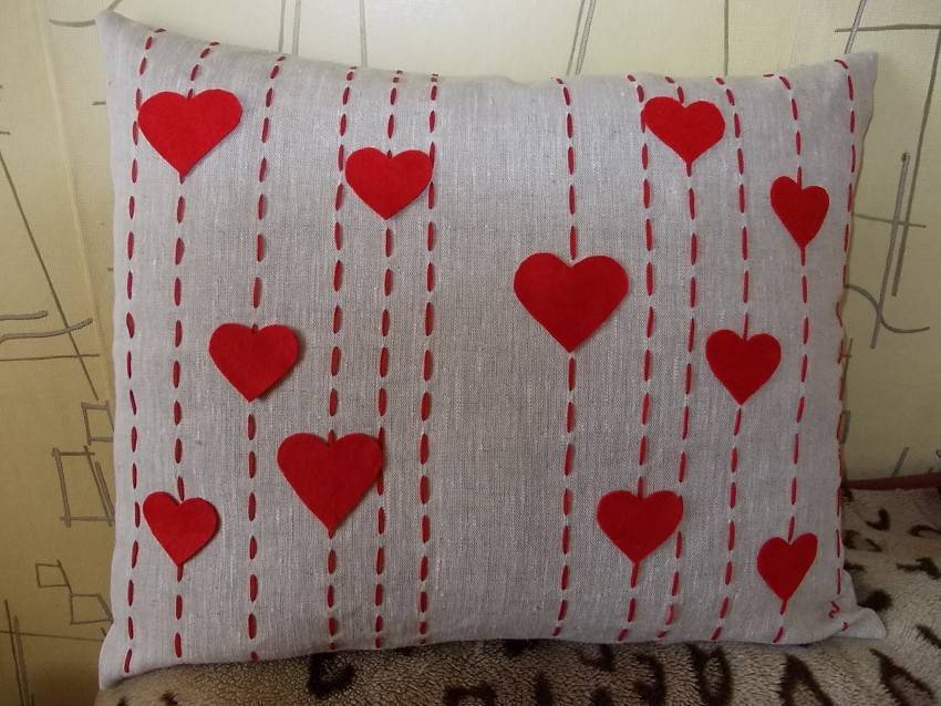 Итак, изготовление подушки закончено и остается только оформить дизайн. Можно оставить и так, но украшение сделают её праздничной.
