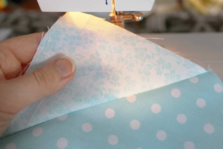 Теперь можно сшивать между собой лепестки. Кусочки ткани складываются лицевой стороной вовнутрь, и от середины делается машинная строчка. Начинающие мастера пользуются одной хитростью: шаблон без припусков укладывается на лоскут и обводится мелком — получается линия, по которой пройдет строчка. Это удобно, и возможность прошить криво сводится к минимуму.