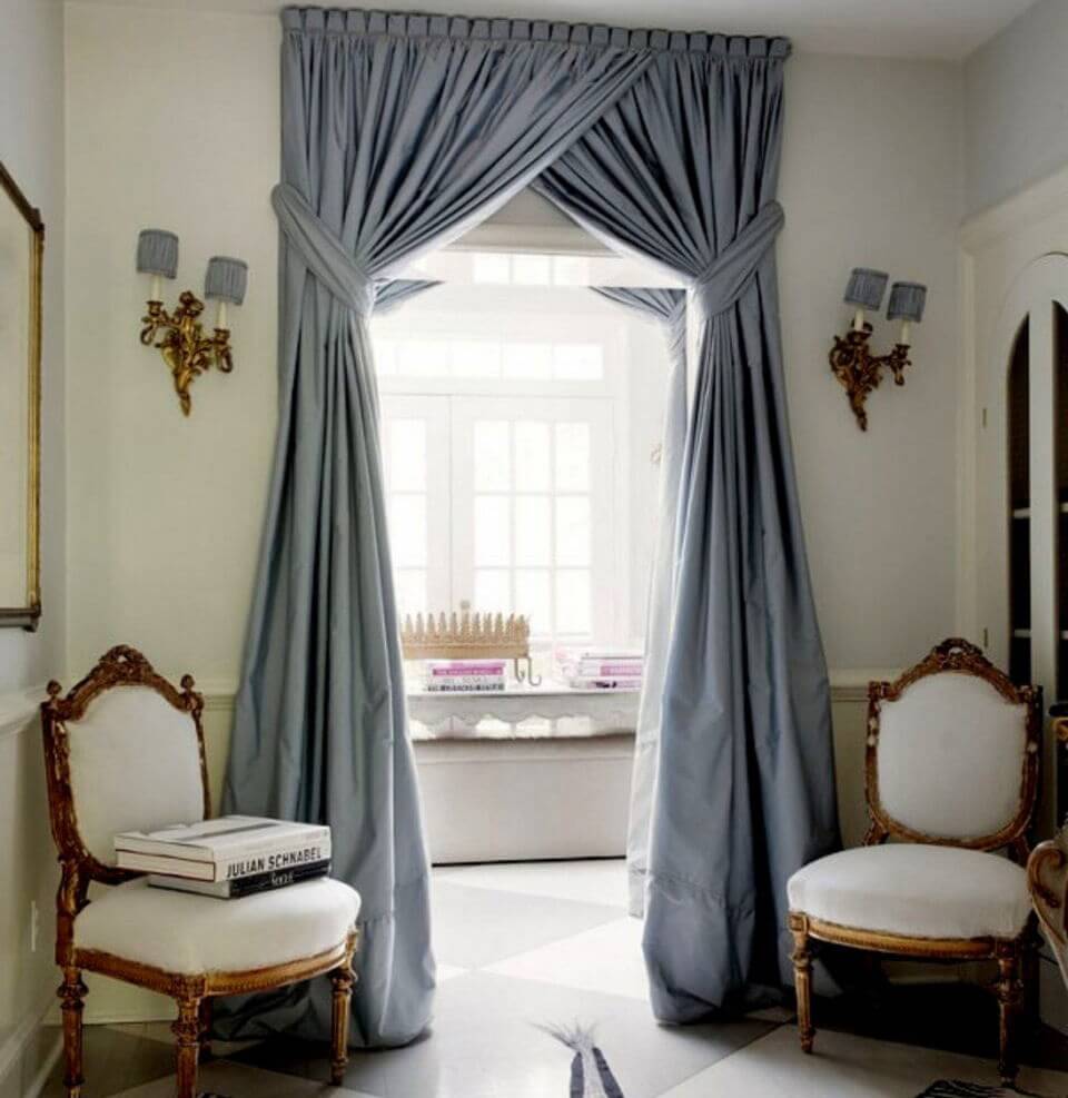 Декоративные шторы в форме песочных часов получают с помощью текстильного полотна, стянутого по центру декоративной лентой или другим элементом декора.