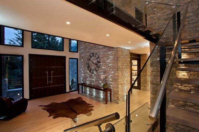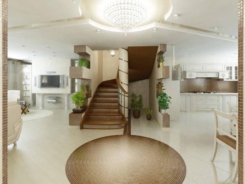 В качестве украшения классического интерьера, если посмотреть фото дизайна коттеджа могут стать лестницы из камня или дерева. Как напольное покрытие лучше всего выбирать паркет.
