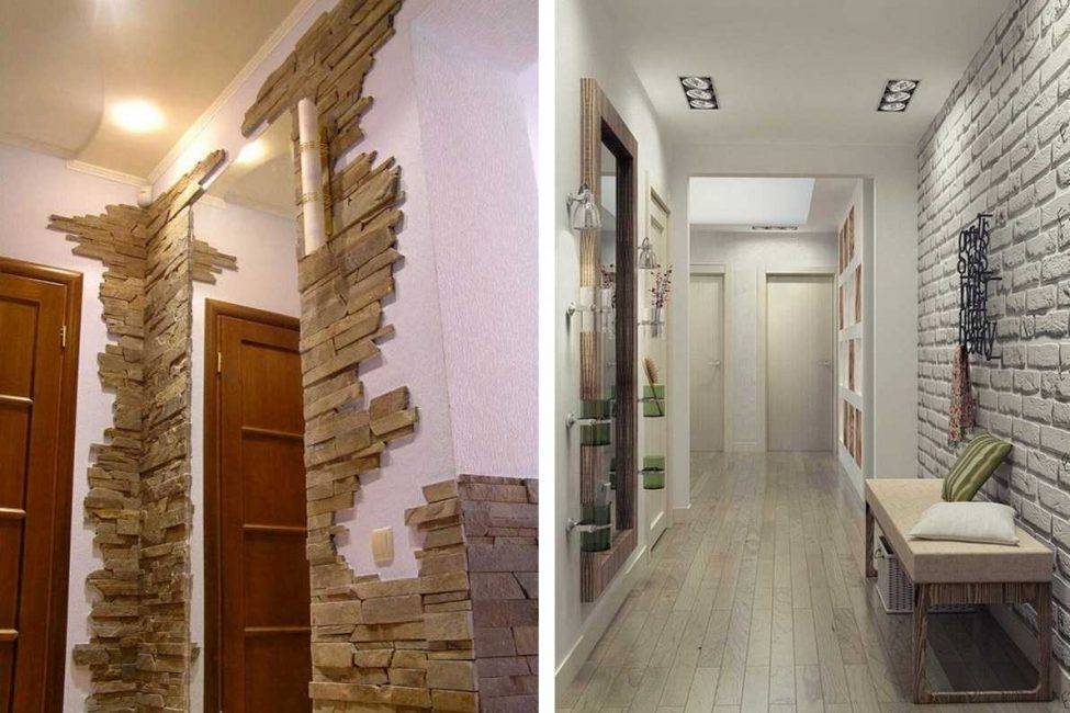 Варианты внутренней отделки стен коридора искусственным камнем могут быть разными. Декоративный камень в прихожей можно выложить на стене у входа, а также частично на двух смежных стенах. Он может занимать половину стены, располагаясь не только стандартно, но и по диагонали. В зависимости от площади коридора он может быть украшением лишь одного участка либо иметь поддержку на какой-либо из стен.