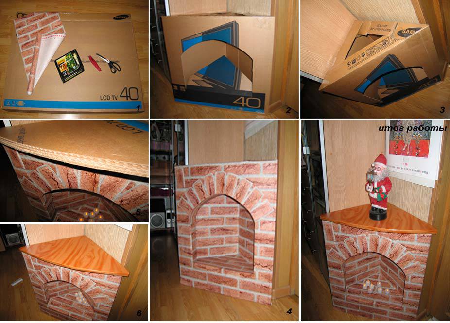 На Новый 2021 год можно сделать не только пристенный камин. Из коробок легко изготовить своими руками и угловую конструкцию. Пошаговая инструкция такого варианта «домашнего очага» поможет в этом процессе.