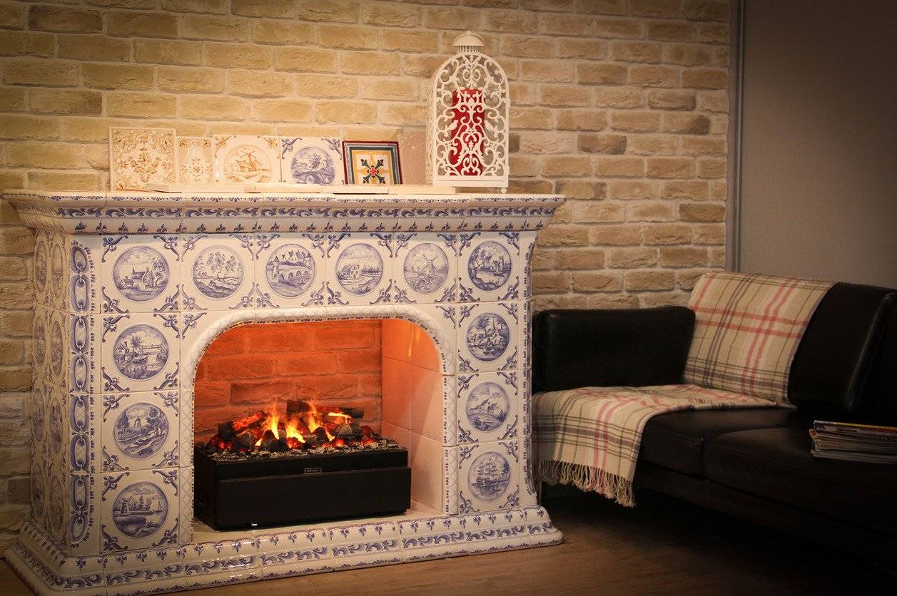 Часто камины обустраиваются при помощи плиточного материала. Имеет аккуратный и привлекательный внешний вид. Отличается относительной простотой установки по сравнению с предыдущим вариантом. Хорошо сохраняет тепло в комнате.
