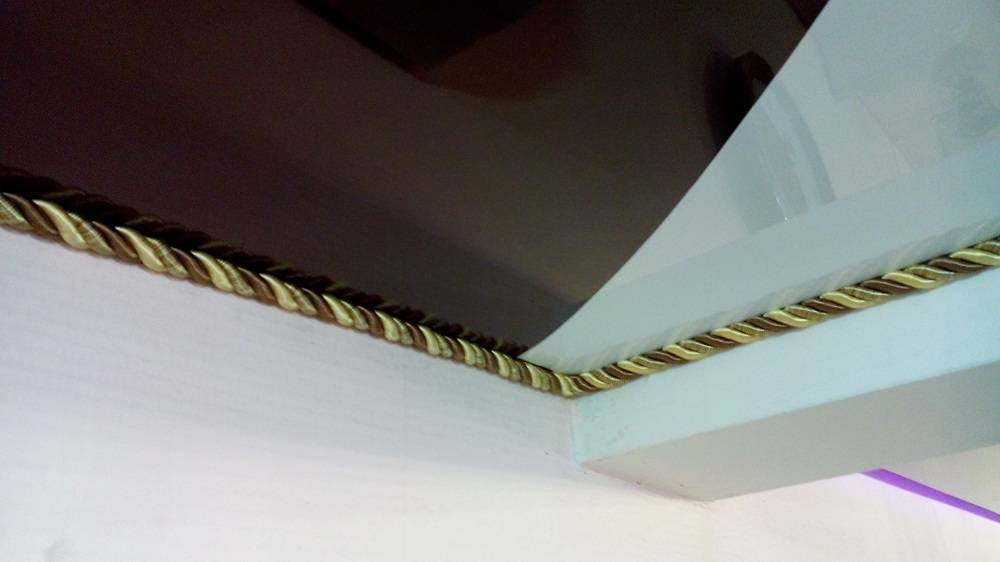 Декоративный шнур должен вплотную соприкасаться с конструкцией потолка и стеной. В противном случае шнур полностью не закроет техническую щель, может выпасть или отойти. Если конструкция натяжного потолка предусматривает наличие кривых линий, то шнур хорошо подойдет для окантовки благодаря своей гибкости. Главное преимущество витого шнура – это обилие цветовых и фактурных решений.