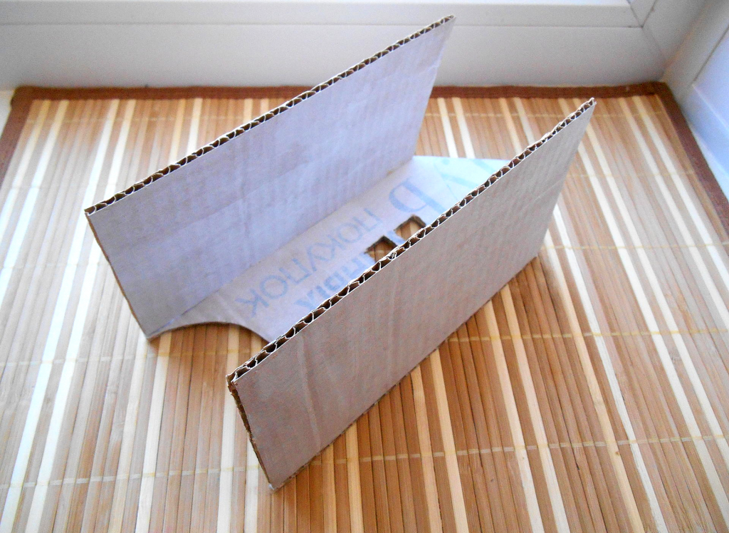 Приклеиваем «черепицу» к крыше с двух сторон. Вырезаем из того же картона две полоски такой же длины, как и крыша. Приклеиваем их как на фото.