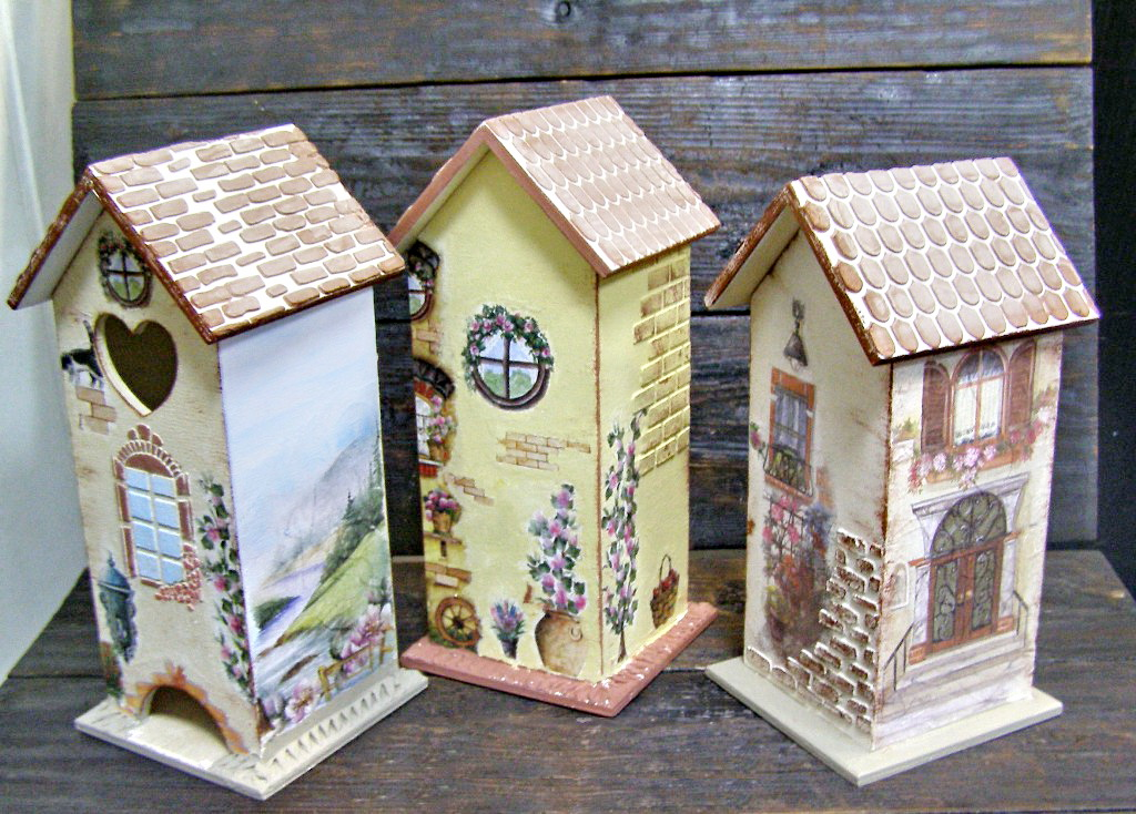 Если делаете домик в стиле прованс, выбирайте неяркие растительные мотивы для рисунка. В английском стиле хороши розы, маленькие чайнички и чашечки. Есть наборы салфеток для декупажа, тематические, вам не придется подбирать мотивы, фоны, фрагменты, орнамент, все идет в наборе.