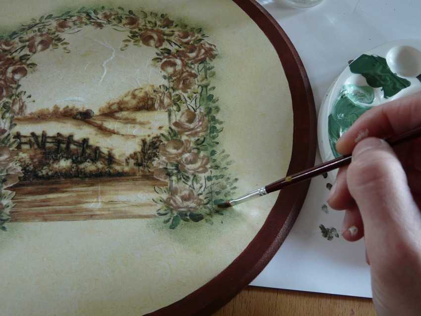 - На поверхность наносится 1-2слоя акриловой краски, после высыхания которой, все неровности обрабатываются мелкой наждачной бумагой. На светлом фоне наклеенный рисунок выглядит ярче. Если нужно затемнить часть поверхности, применяются соответствующие краски, наносящиеся с помощью мягкой губки.