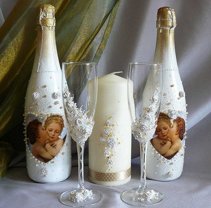 Стеклянную поверхность нужно обрабатывать в перчатках, чтобы не оставлять отпечатков. Технология работы над бутылкой различна. Применяют не только салфетки , но и шнуры, шпаклёвку, и декоративные элементу.