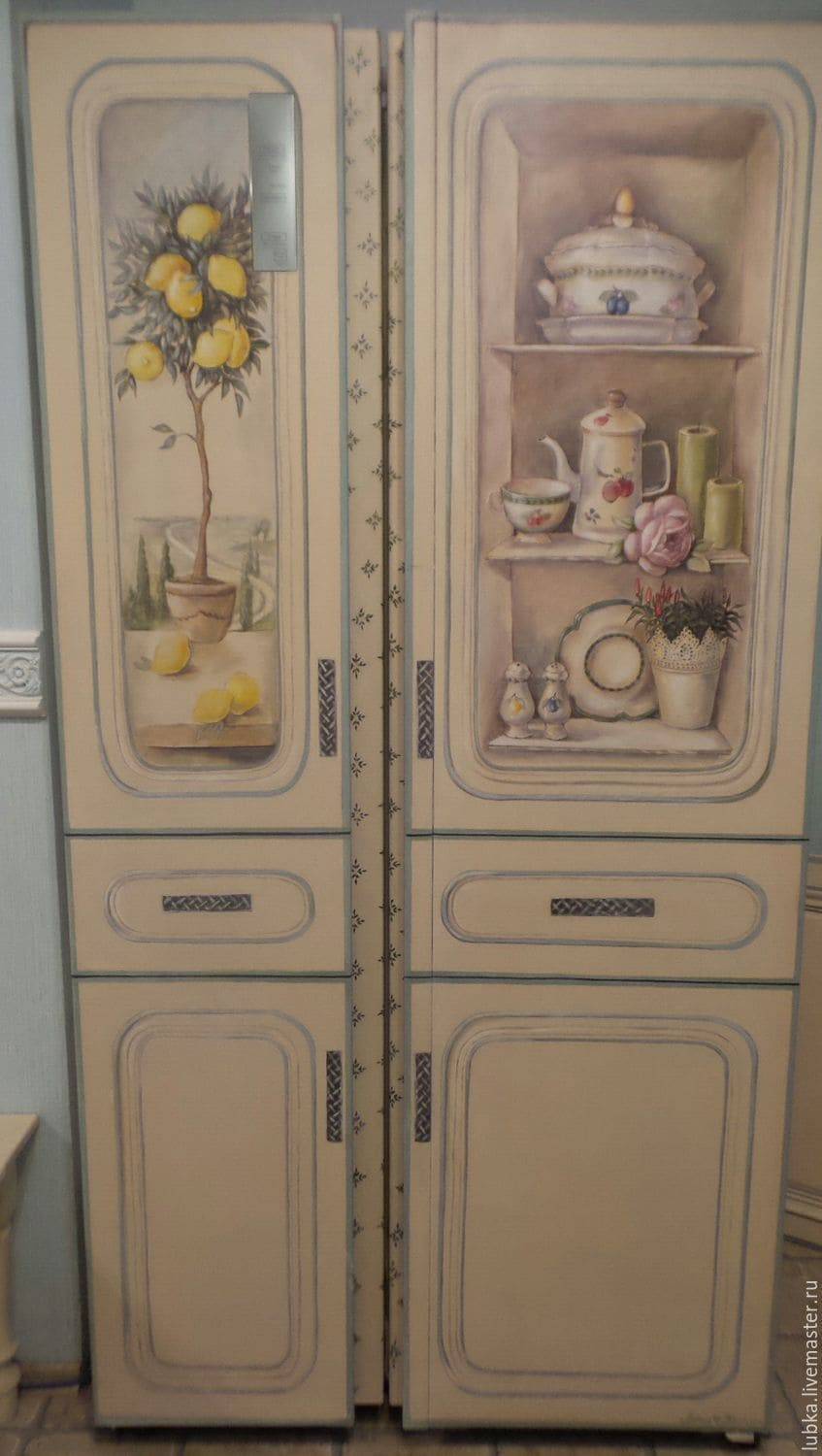 Умеющие рисовать могут кардинально и с удовольствием преобразить главный кухонный агрегат. Нужны грунтовка, краски, кисточки, карандаши, малярный скотч. Можно использовать дополнительно финишное покрытие, например лак, подходящий для выбранных красок. Подробнее с техникой росписи можно познакомиться