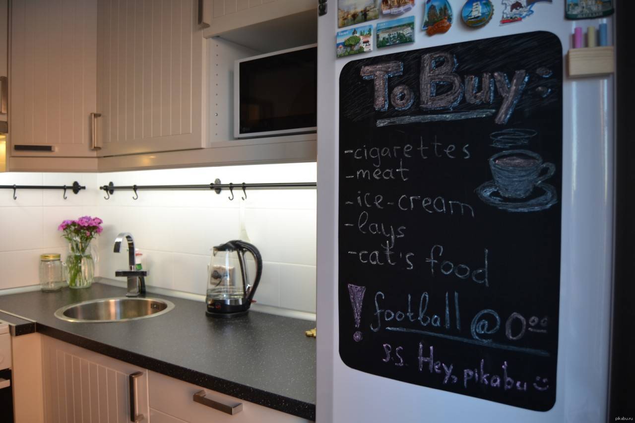 Обычный кухонный предмет может стать грифельной доской как для детей, так и для взрослых. Здесь можно будет рисовать, писать записки и списки продуктов. Преобразить холодильник можно при помощи специальной черной краски, которая продается в строительных магазинах и отделах с товарами для творчества. Подробная инструкция переделки .