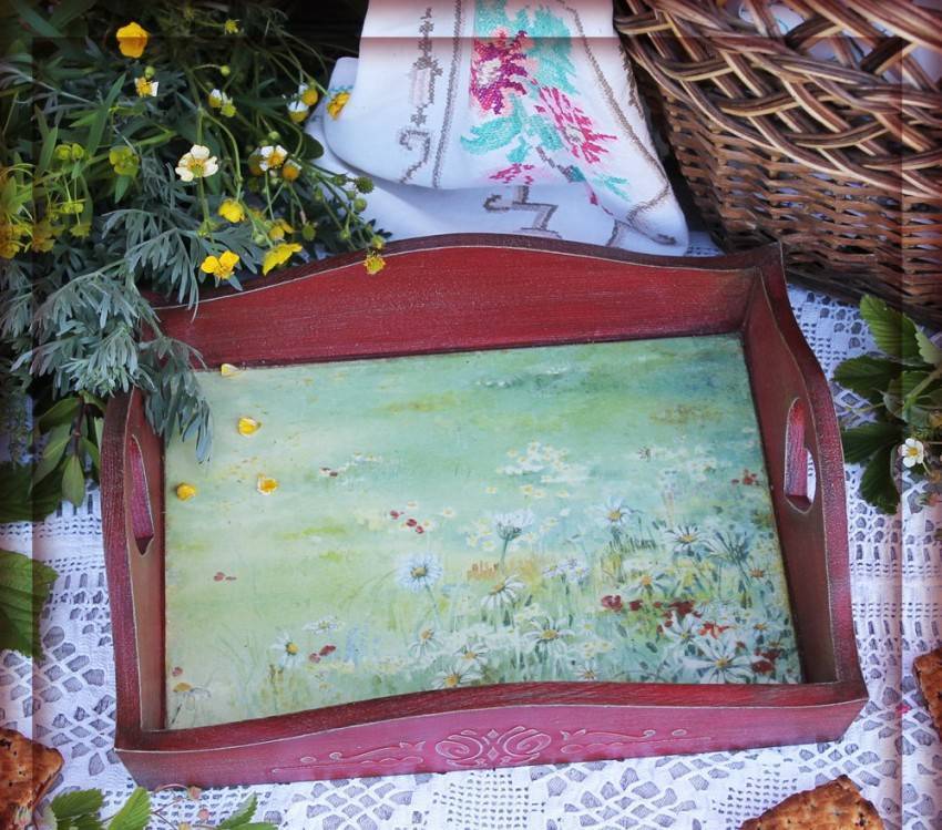 После освоения метода декпажа можно попробовать сделать свою первую работу. Новичкам стоит выбирать небольшие изделия с плоской поверхностью для декорирования. Лучше всего для этого подходит разделочная доска из дерева.