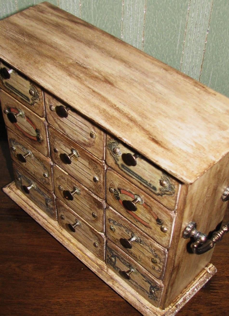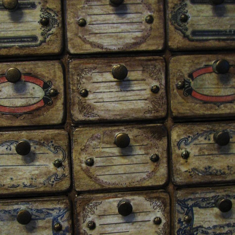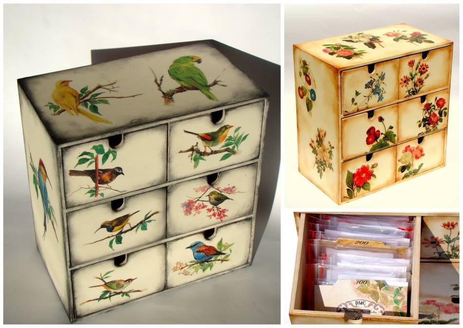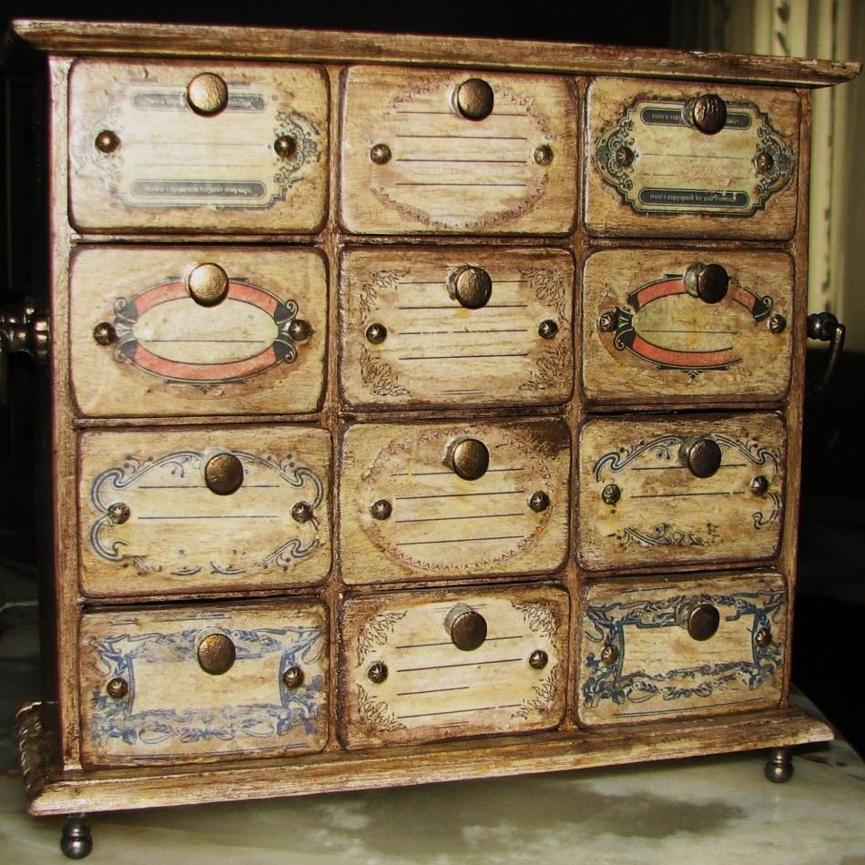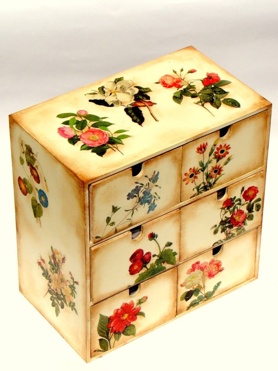 Затем приклеиваем их к конструкции. Разравниваем и удаляем пузырьки воздуха. Декоративные карты приклеивать не только на лицевой стране, но и по бокам. Итак, самые крупные детали рекомендуется размещать посередине. Более мелки снизу и сверху комода