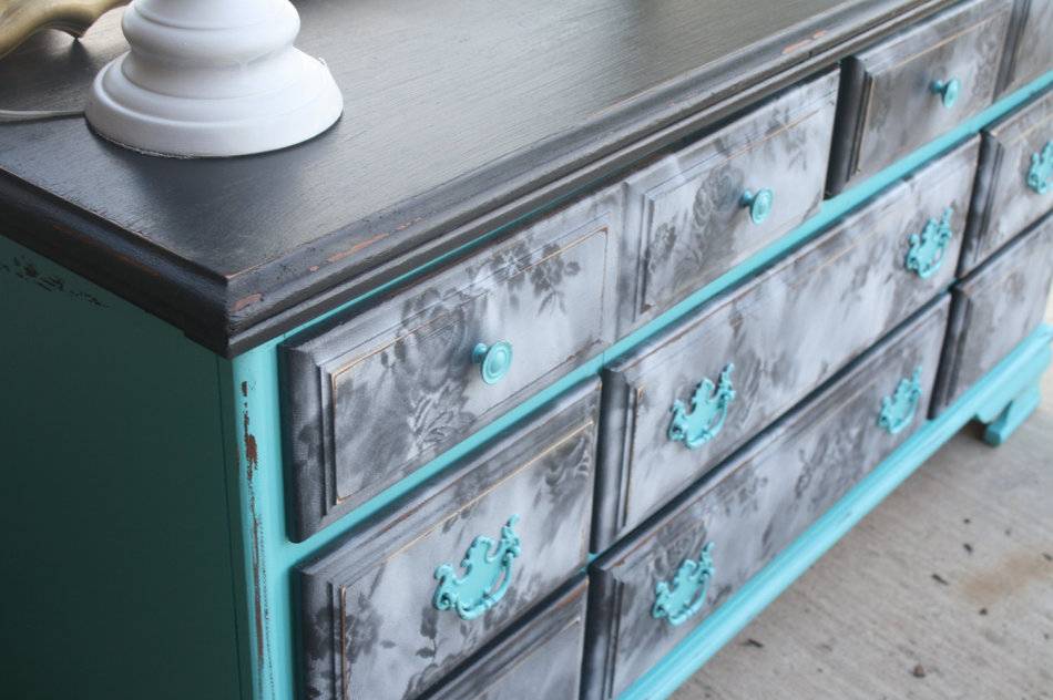 Также в демонтаже можно использовать не только рисунки, но и завитушки и вензеля. Нарисовать их можно с помощью простой малярной кисти. В конце по желанию комод можно покрыть несколькими слоями лака. Их должно быть как минимум 3, перерыв между нанесением 3 часа.