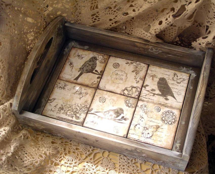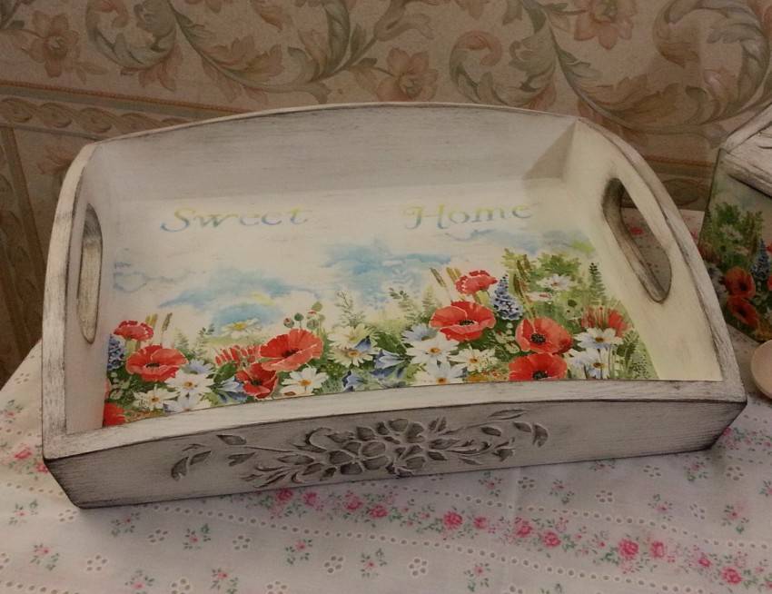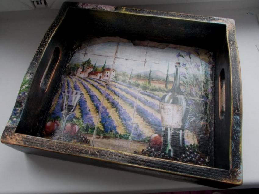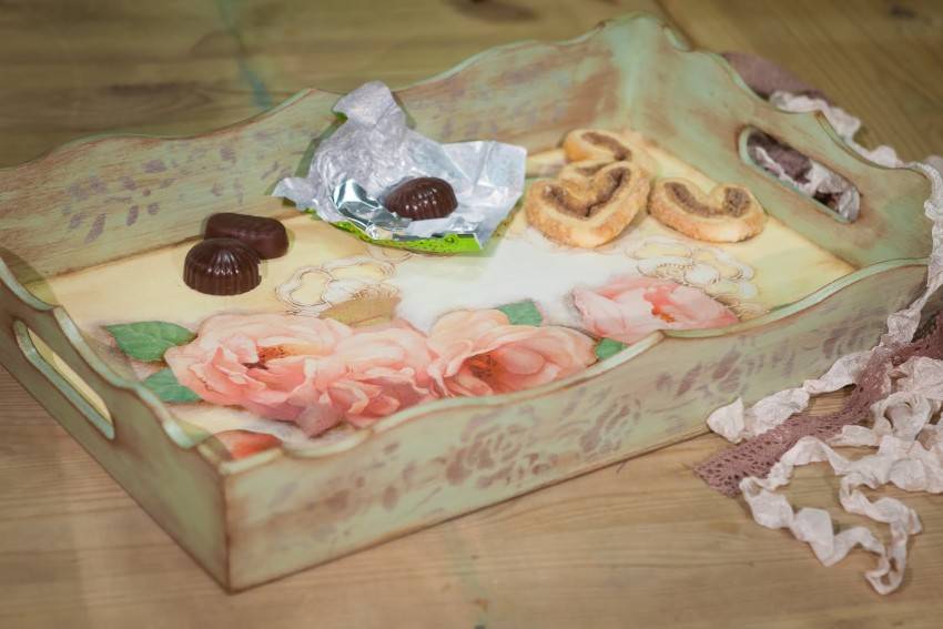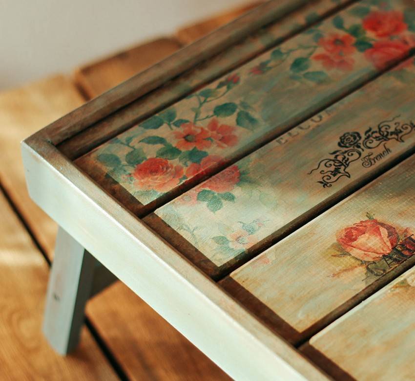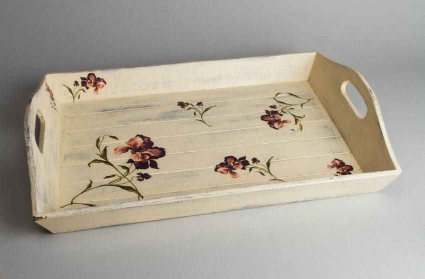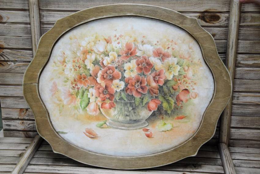 Эта техника используется для создания необычных предметов декора. Готовые изделия идеально дополнят интерьер в стиле винтаж, кантри или классика. Как правило, поверхность имеет неоднородную структуру. Рисунок позволяет придать изделию элемент старины.
