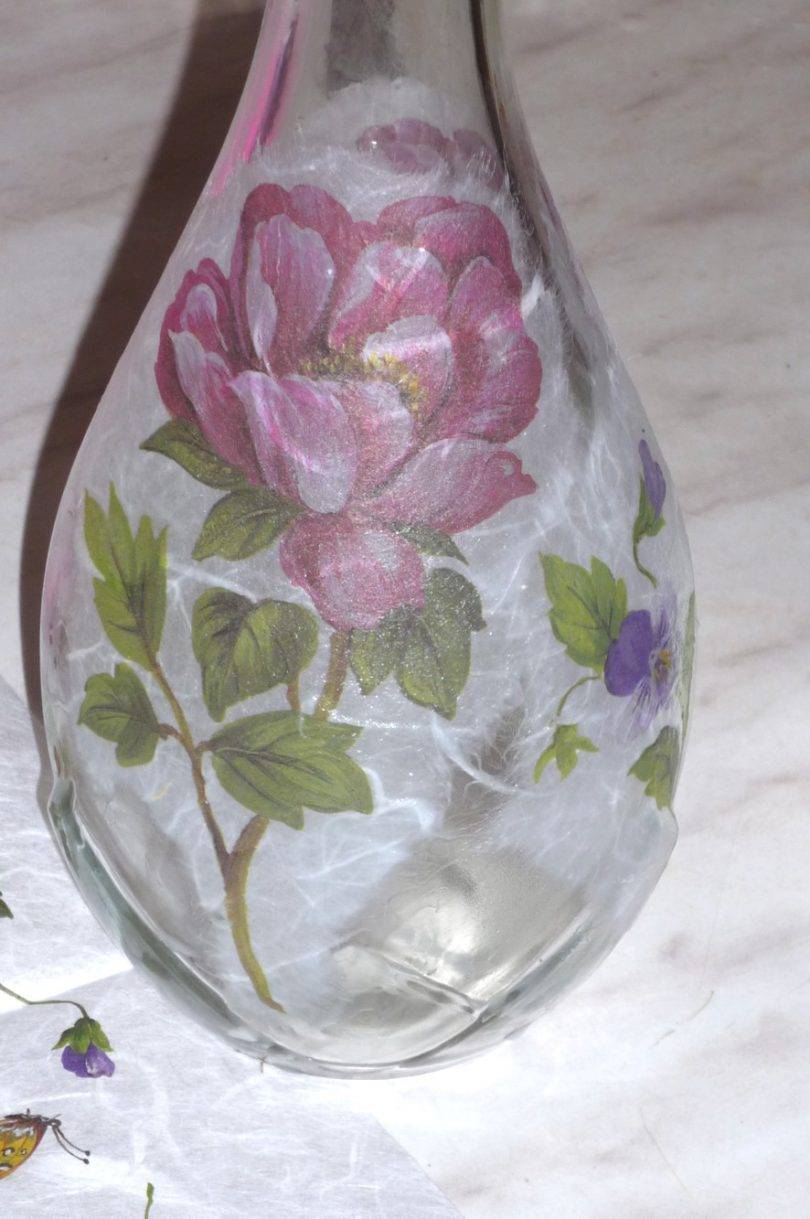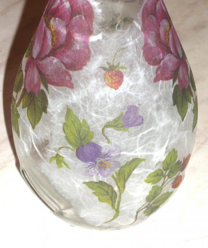 Пример прямого декупажа приведен выше. Декорирование проводится на наружной части вазы, то есть на стекле.