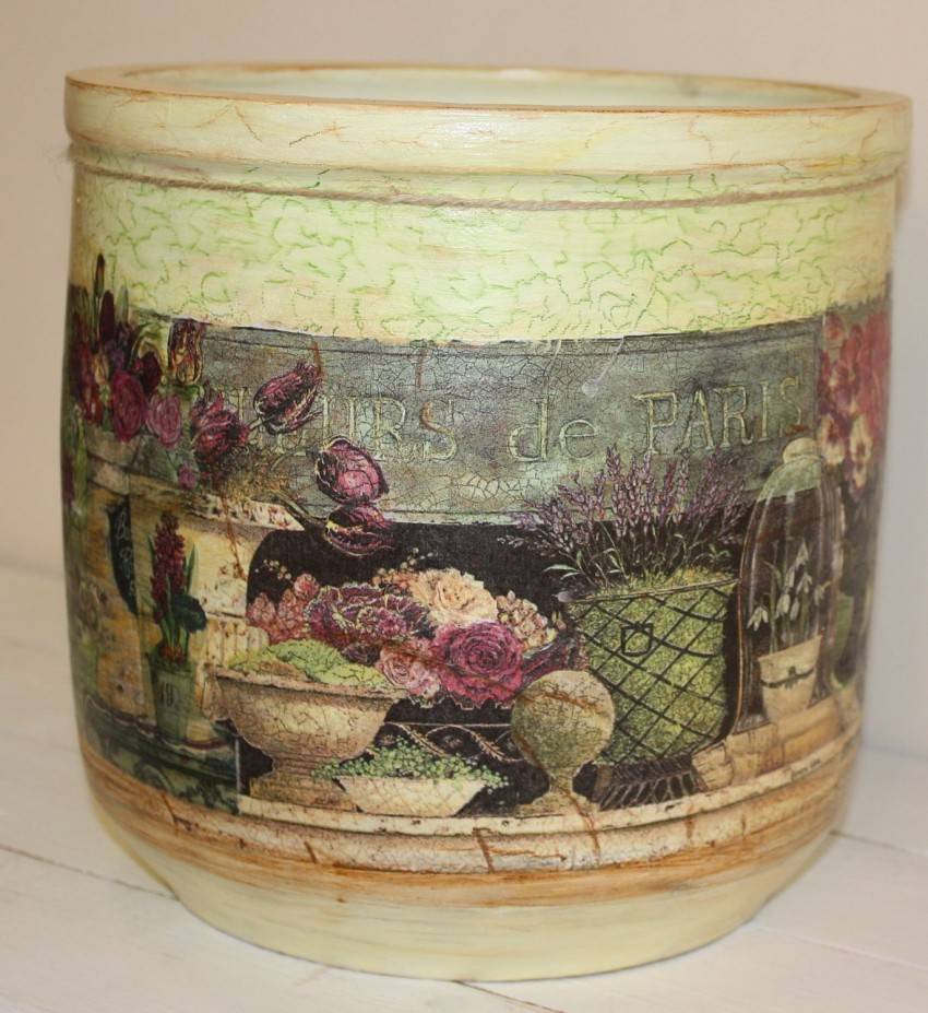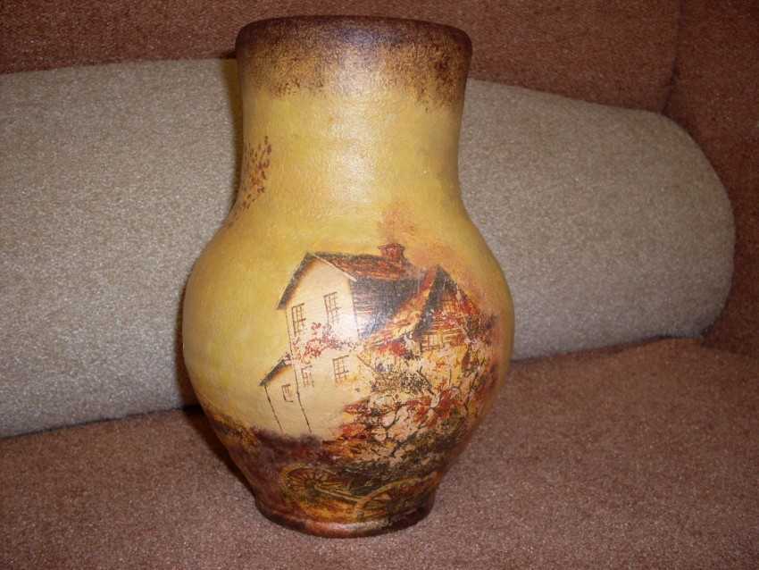 Эта техника декупажа вазы салфетками может из абсолютно невзрачного предмета сделать настоящий шедевр. Винтажный вид таким изделиям придает специальный лак, который наносится между слоями невысохшей краски.