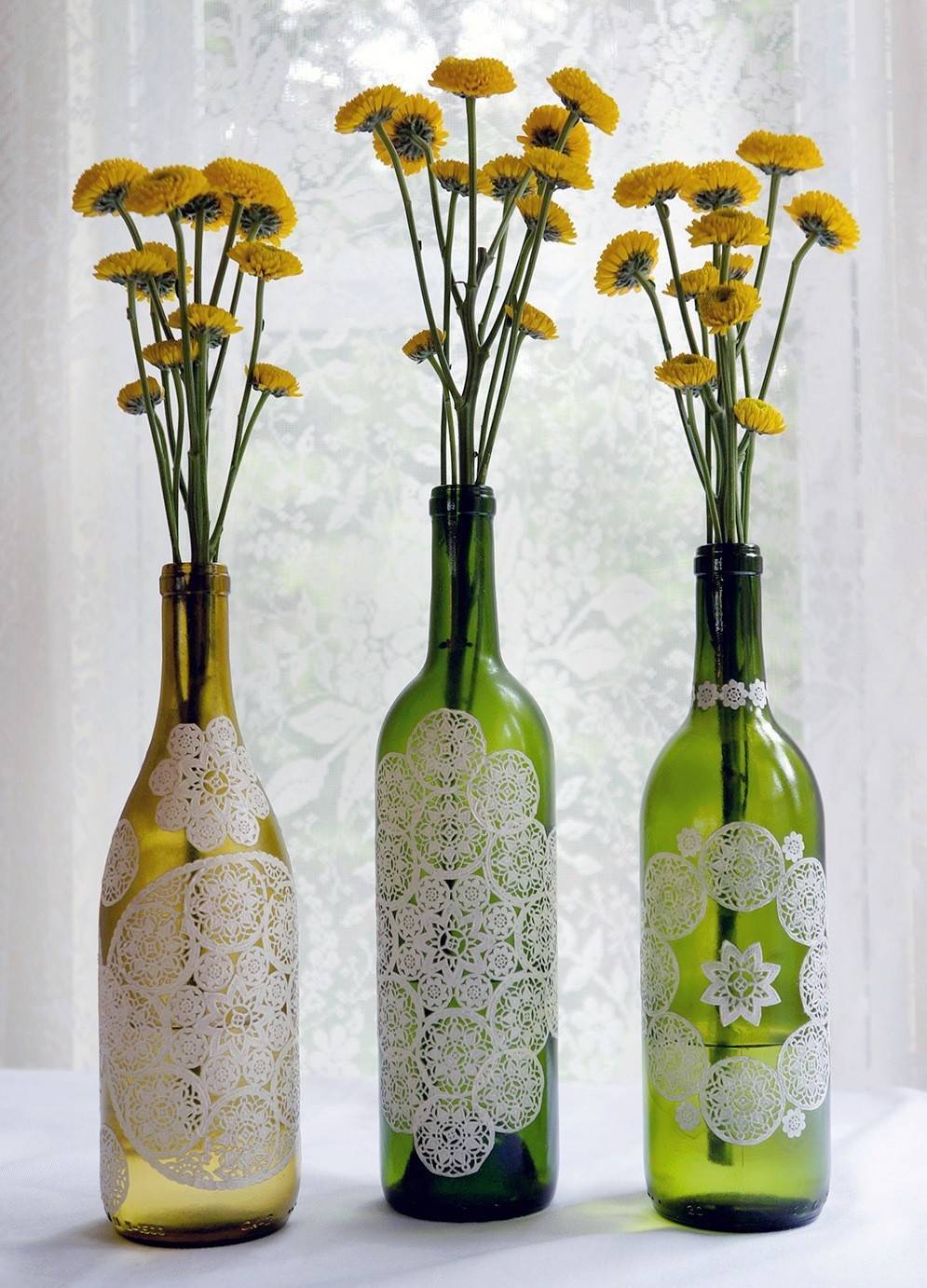 Очень хороший вариант для декупажа бутылки в подарок женщине – приклеить кружева.