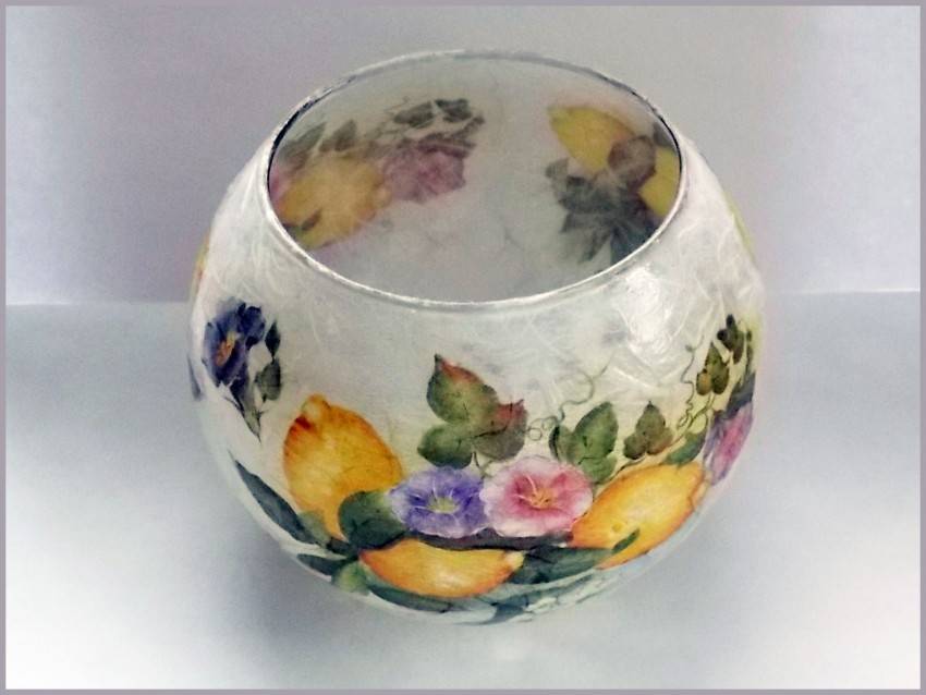 Приступая к работе над вазой, с нее следует смыть пыль, просушить, а после проделать все, как в прямом декупаже, только в обратную сторону. Сначала под стекло клеится картинка, затем накладывается кракелюр, тушуется фон и закрепляется финишным лаком.