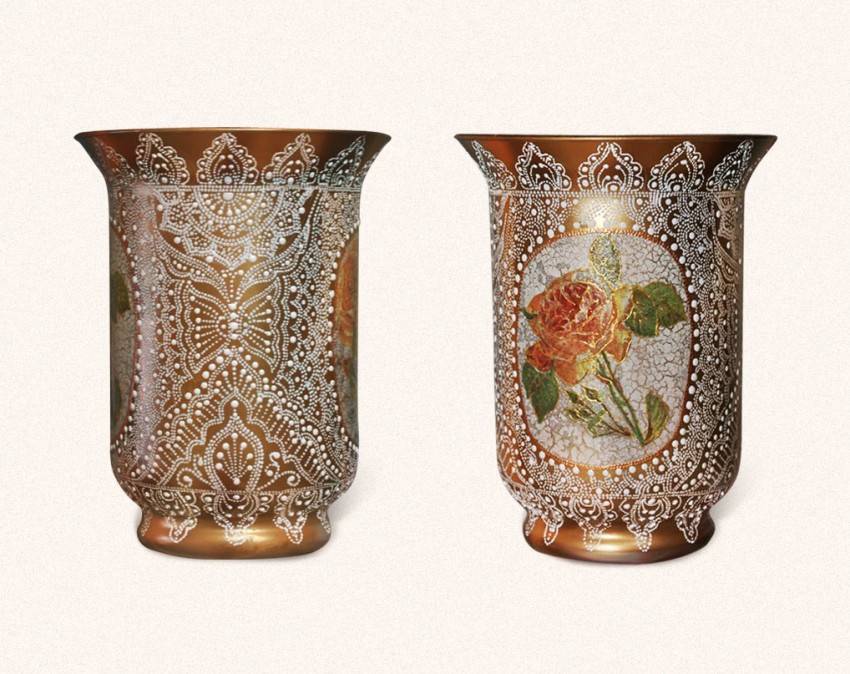 Для техники декупажа вазы салфетками применяют специальные клеевые составы, которые после высыхания образуют фактурные линии в виде выступов или неглубоких трещин. В дальнейшем их заполняют позолоченной краской, которая добавит частичку роскоши в дизайн изделия.