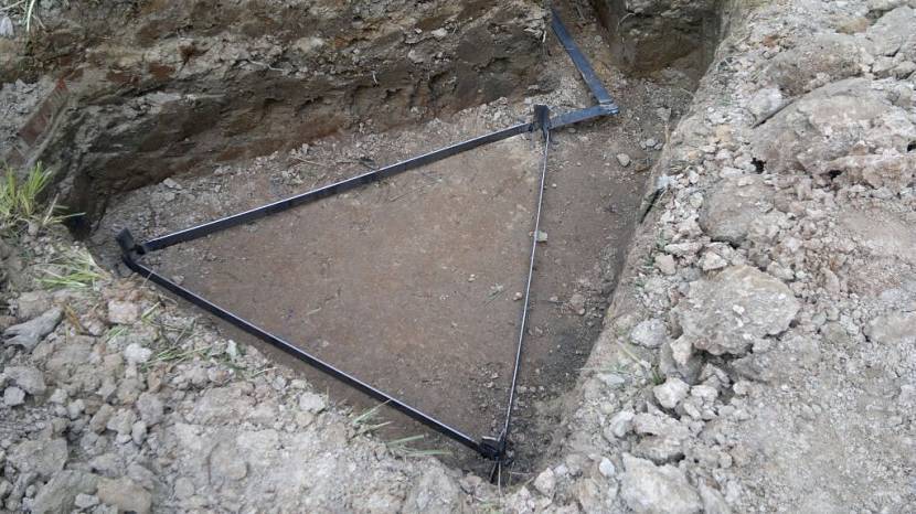 Изначально заготавливаются 3 металлических прута по 3 метра в длину и 3 сантиметра в диаметре. Далее выкапывается канава в виде треугольника с равными сторонами по 1 метру в длину. Глубина канавы зависит от уровня промерзания почвы. Металлические прутья размещаются в углах вырытой траншеи;