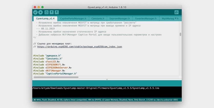 6. В архиве находим файл прошивки GyverLamp_v1.5.5.ino (или более свежую версию) и открываем его в Arduino IDE.