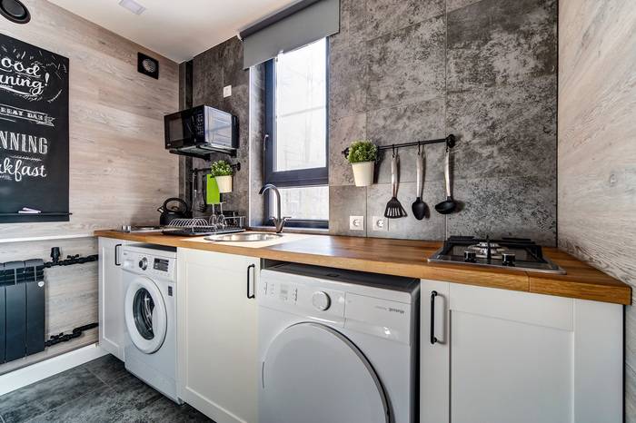 Собственно, после этого все самое сложное было позади. Затем я установил столешницу (делал на заказ), в нее уже – раковину, плиту, встроил стиралку и сушилку. Приделал полку для микроволновки. Повесил шкафы над обеденным столом, добавил всяких «держалок» для ложек-вилок и цветов. Жена уже добавила декора на свое усмотрение. Результатом доволен.