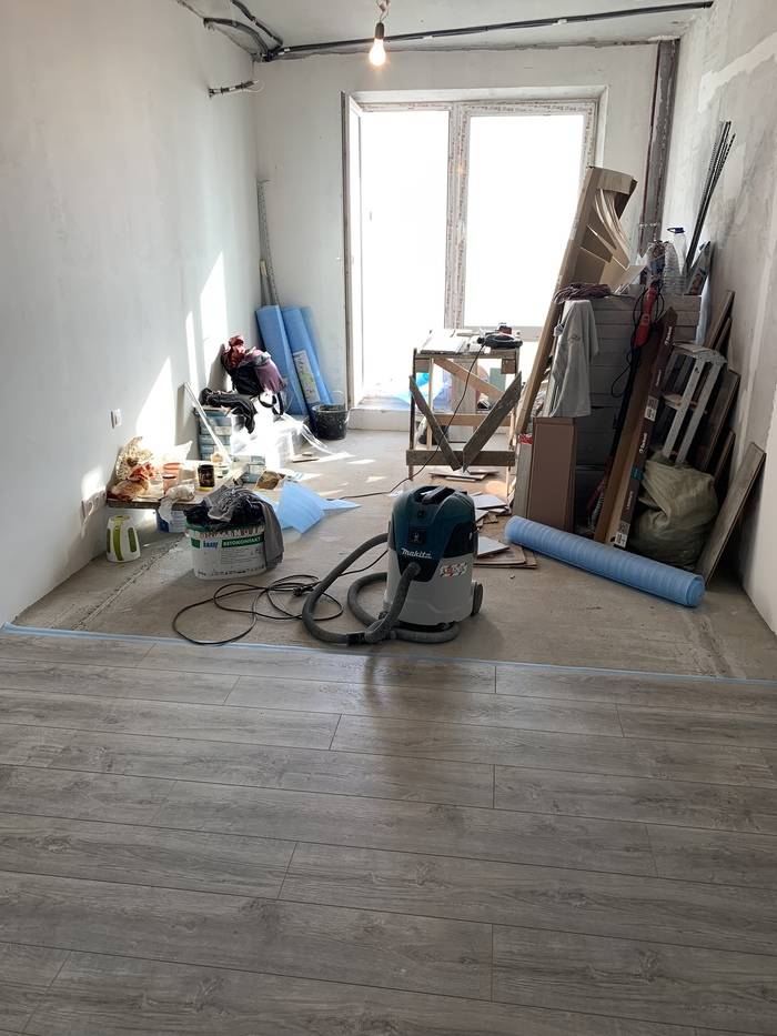 Считаю, что самым сложным был демонтаж всего, что в этих комнатах вообще было. Всей семьей мы сдирали обои, «отдирали» жуткий паркет, хотя многие меня уговаривали его оставить. Очень не хотелось за ним ухаживать, так что я предпочел линолеум с рисунком под ламинат – мне кажется, смотрится вполне неплохо.