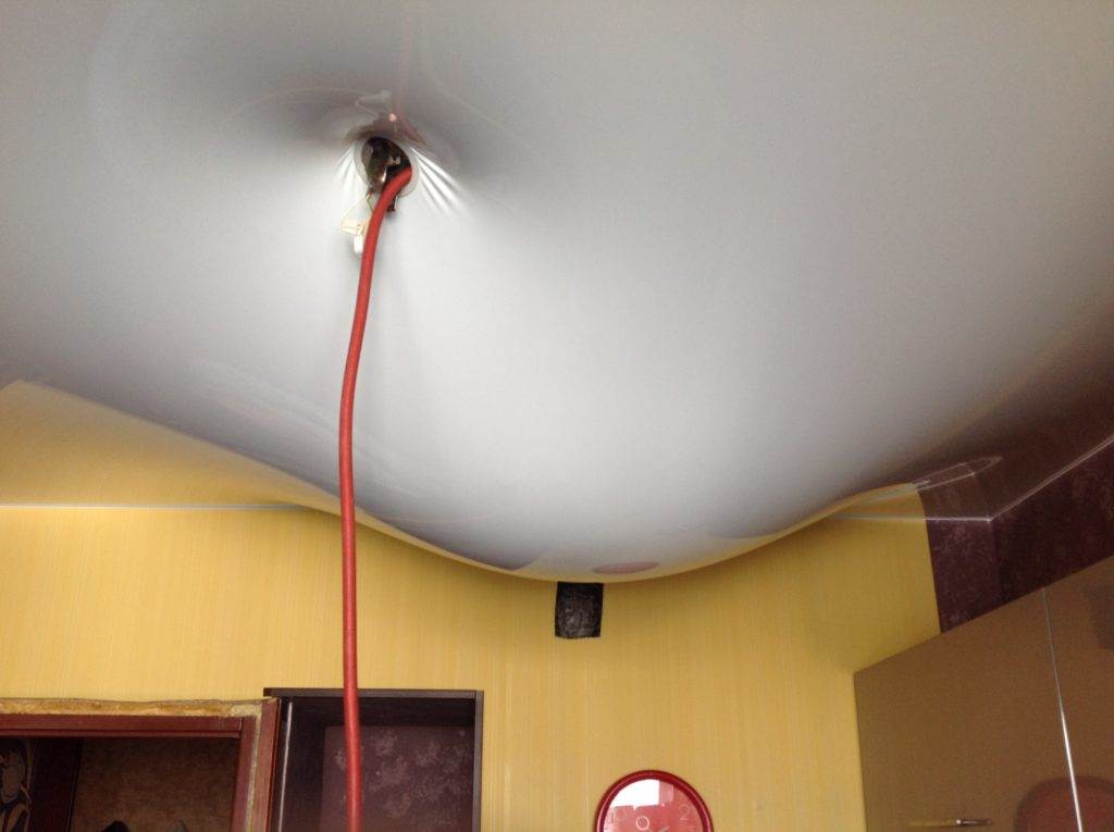 При самостоятельном устранении проблемы в первую очередь нужно аккуратно слить воду. Для этого понадобится частично демонтировать потолок, чтобы жидкость могла стечь, а полотно осталось невредимым. Стоит использовать всевозможные приспособления в виде импровизированных желобов и каналов.