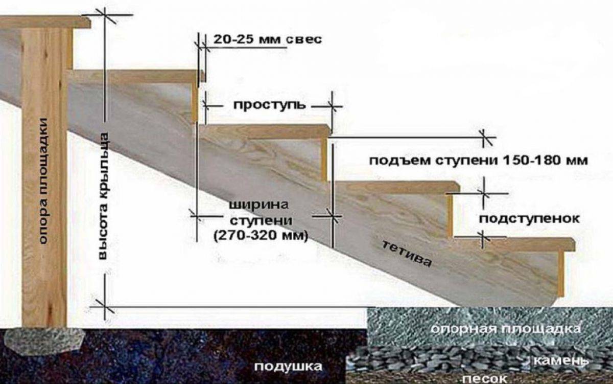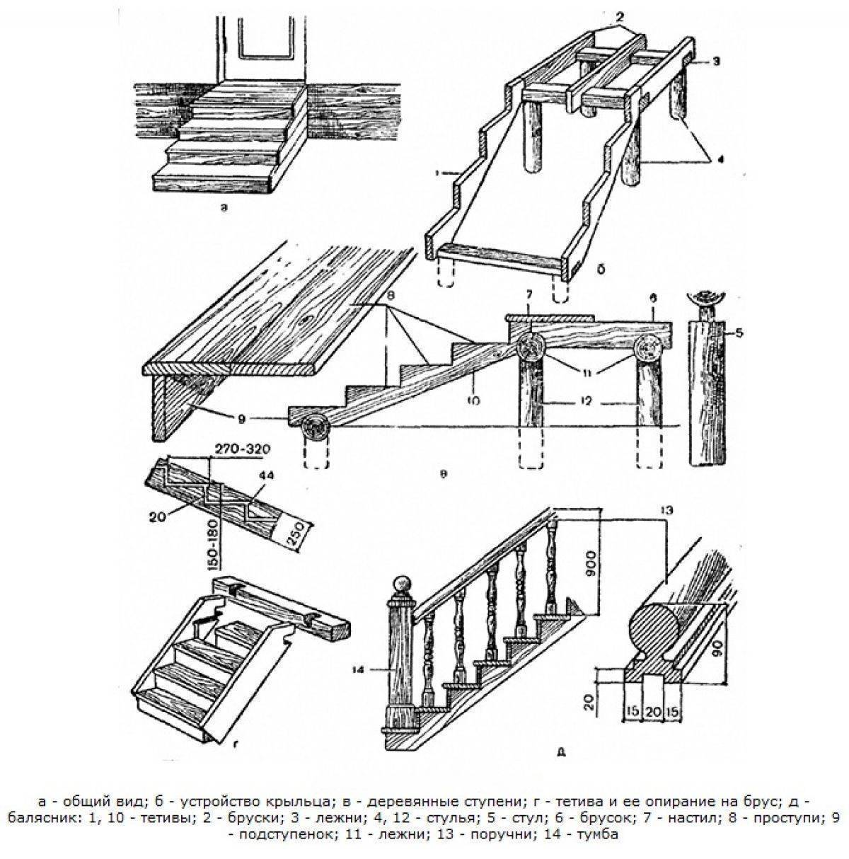 Крыльцо состоит из горизонтальной площадки, к которой ведут наклонные марши (ступени). Оптимальная ширина марша составляет 1200*1450 мм. Состоит он из тетив (брусков, расположенных под наклоном), ступеней и перил. Ширина тетивы соответствует ширине ступеней, а ее толщина — 60-70мм.