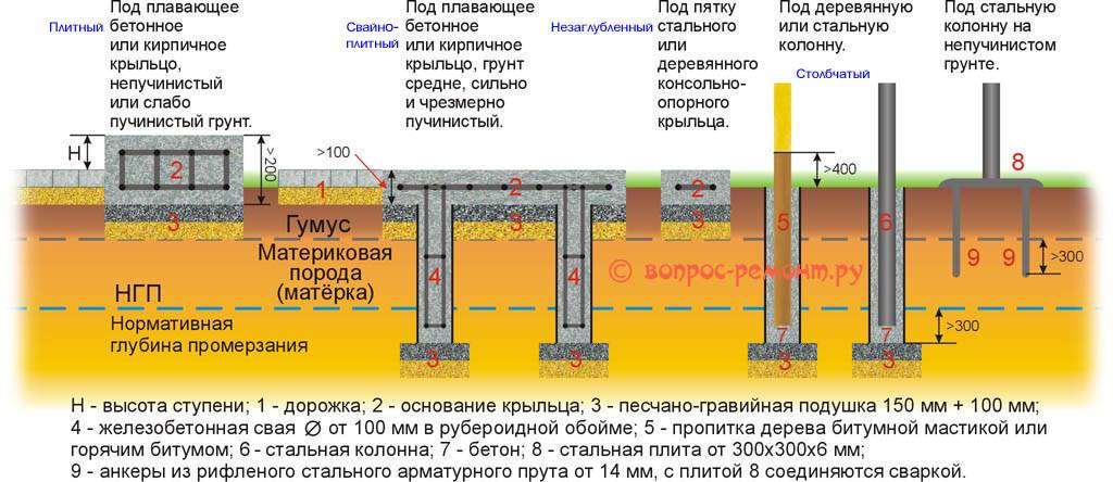 Схемы фундаментов и оснований крыльца и колонн для его навеса