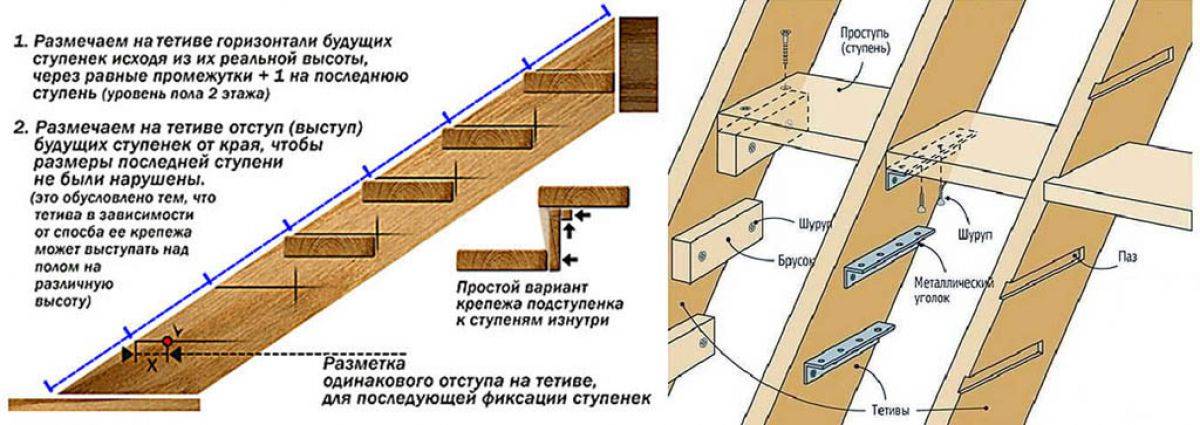 В случае с древесиной лестница устанавливается на несущую балку и ребра зубцов. Простой тип металлического сооружения создается путем сварки из уголков и швеллеров.