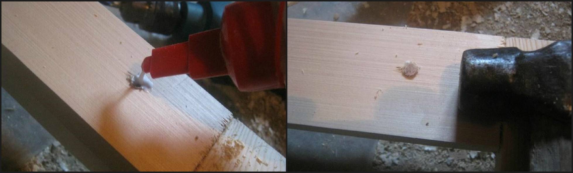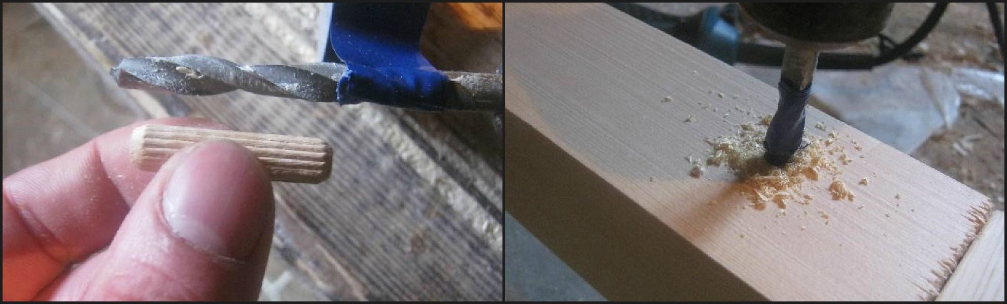 Если оставить все в таком виде, то раму легко расшатать, и она деформируется. Чтобы такого не произошло, потребуется дополнительно укрепить стык. Для этого необходимо воспользоваться шкантом. Ровно по центру узла примыкания сверлится отверстие. В него вставляется деревянный цилиндр согласно диаметру отверстия. Предварительно его необходимо также пропитать клеем. Чтобы в процессе высыхания рамы для окон не потеряли свою конфигурацию, их можно зажать струбцинами.