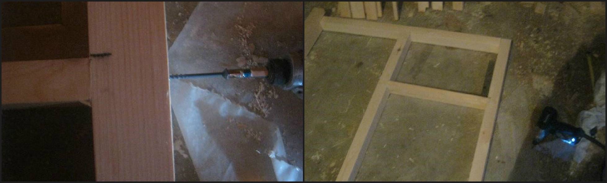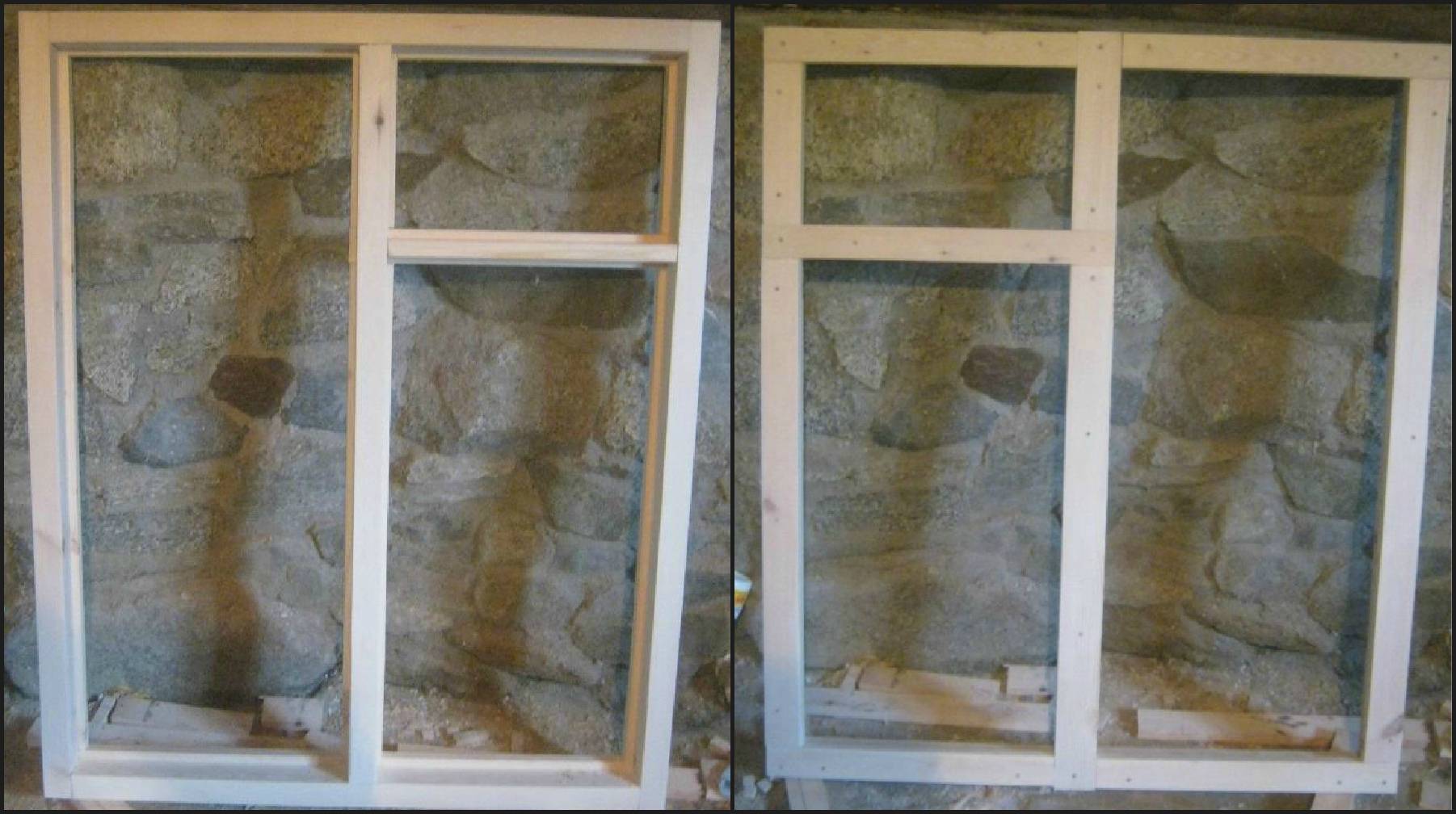 Каждая половина окна изготавливается отдельно друг от друга, а одна из них должна иметь более тонкую раму. Она соединяется с основной, посредством навесных петель, таким образом, создается открывающаяся створка. С помощью саморезов к раме крепится вспомогательная ручка, а в вертикальном брусе делается паз для закрывания створки.