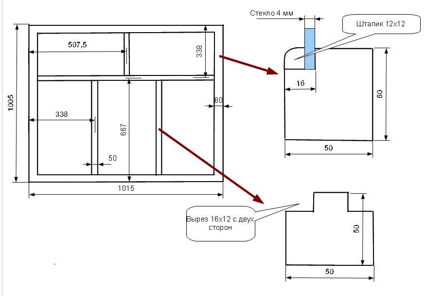 Если размеры полностью совпадают, стекло сверху закрепляется штапиками и фиксируется тонкими гвоздями. В случае вставки двух и более дополнительных стёкол, посередине рамы монтируется вертикальный брус, имеющий идентичные пазы.
