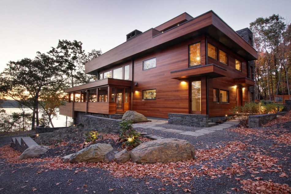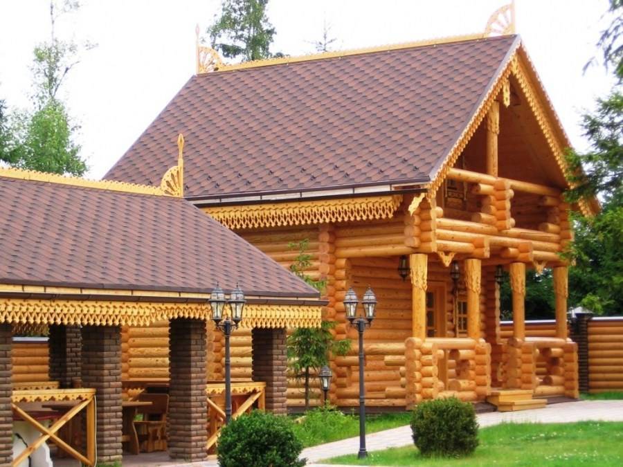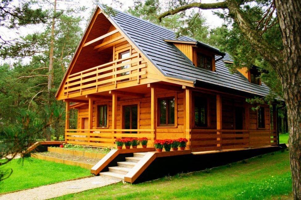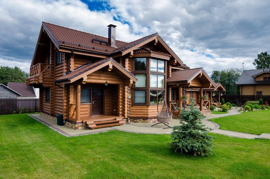 Для отделки каркасного деревянного дома используется сайдинг, нашиваемый поверх ОСП. Бревенчатые строения, а также коттеджи из бруса в дополнительной отделке не нуждаются, за исключением обработки наружных стен яхтным лаком для дерева.