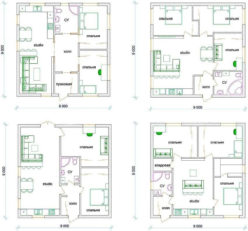 Одноэтажные здания 9х9 м в отношении планировки имеют аналогичные характеристики, что и сооружения квадратной формы меньшего размера. Преимущество строений с длиной сторон 9 м заключается в том, что увеличивается полезная площадь, которая дает возможность разнообразить интерьерное оформление комнат.