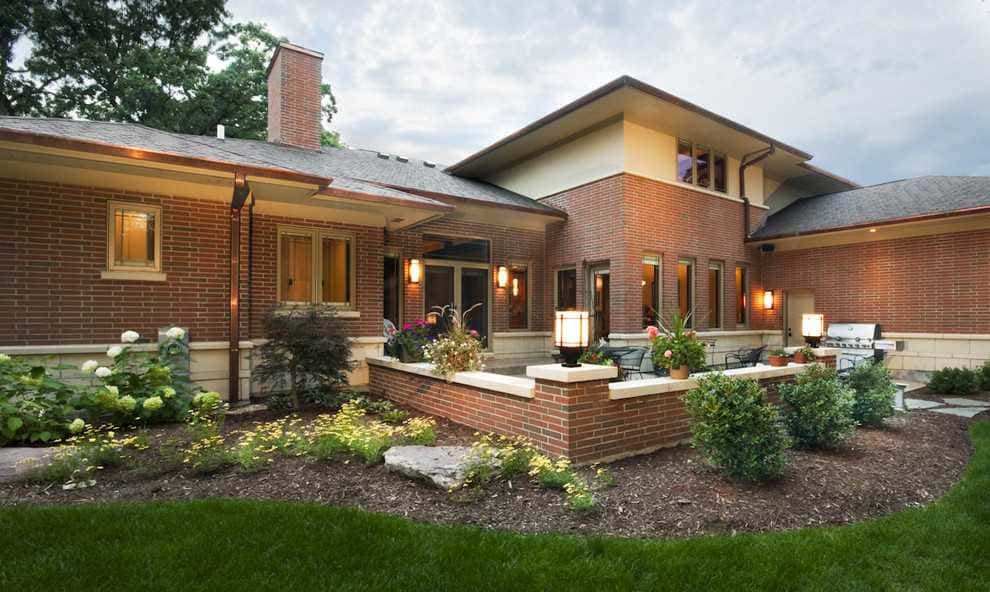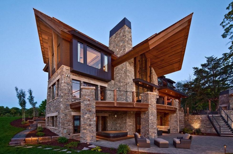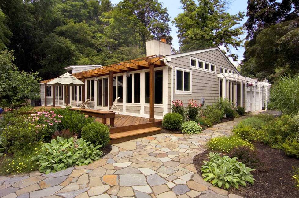 Пример просторного дома с террасой и необычно встроенными окнами мансарды.
