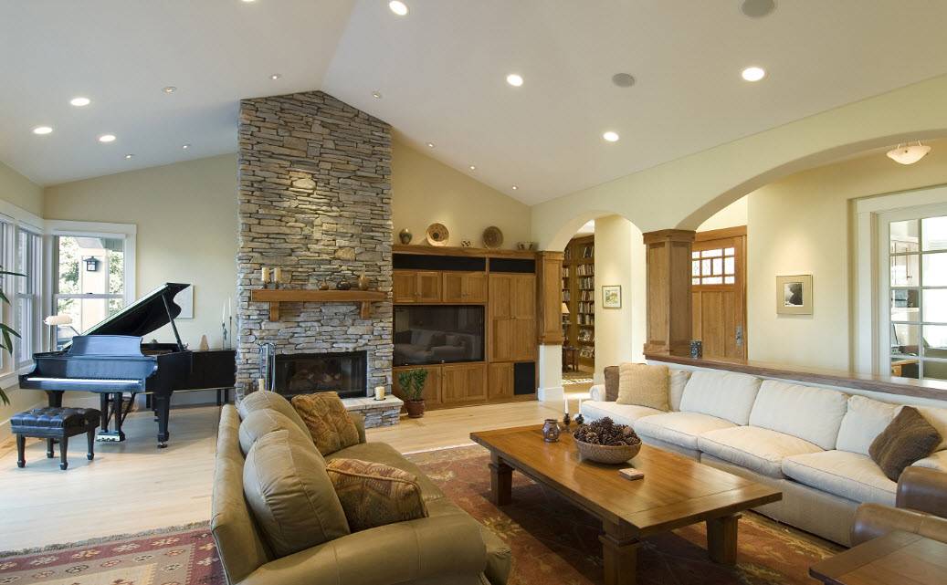 Гостиную в таком доме можно сделать большую на весь холл. С нее делаются выходы в другие помещения. Если комната получается слишком большой, ее можно визуально разделить на функциональные зоны. Тамбур, санузел и кухню в подобных помещениях распределяют в одной части дома, а остальную оставляют для жилых комнат.
