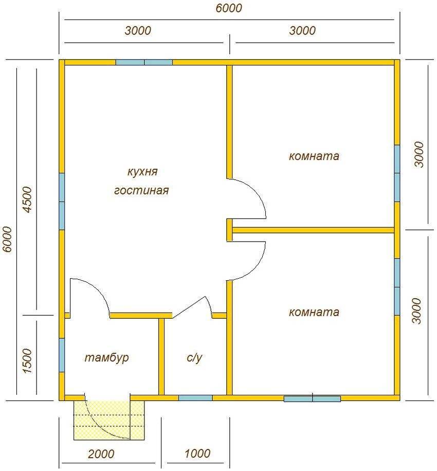 Планировка одноэтажного коттеджа, выполненного из древесины или каких-либо других материалов, основывается на параметрах и особенностях формы. Квадратные сооружения, коим является и дом 6х6 м, считаются оптимальными.