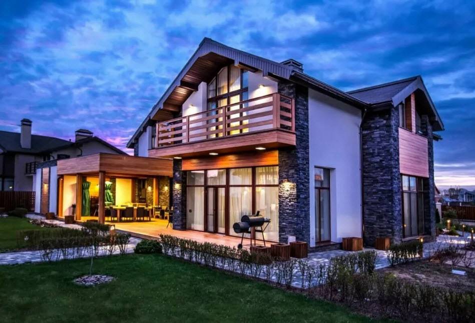 Такие дома стали очень популярными в последние годы. Верхний этаж двухэтажной дачи имеет вид мансарды. Первый этаж предназначен для расположения самых разных помещений: