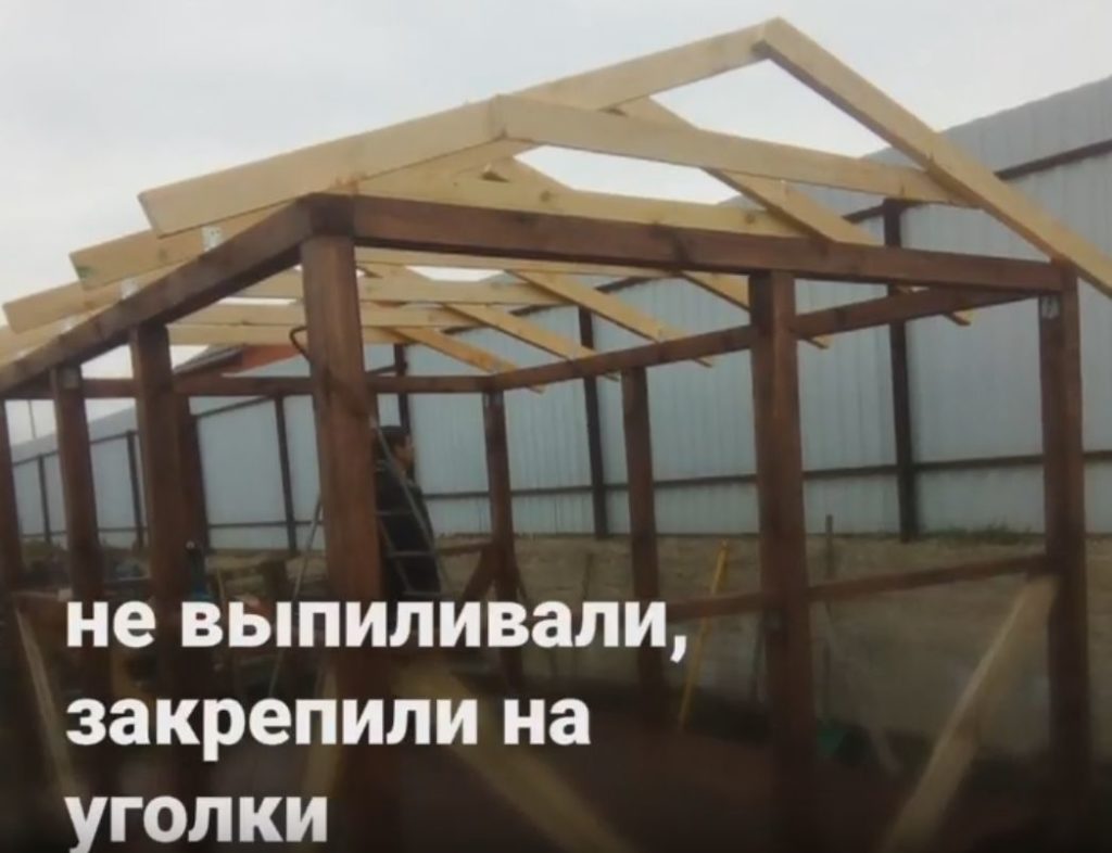 Правильная технология требует выпиливание всех углов и ровную установку стропил между собой стык в стык. В данном случае строители решили сэкономить время и силы и просто зафиксировали стропила на металлические уголки, дополнительно зафиксировав стропильные ноги с помощью затяжек.