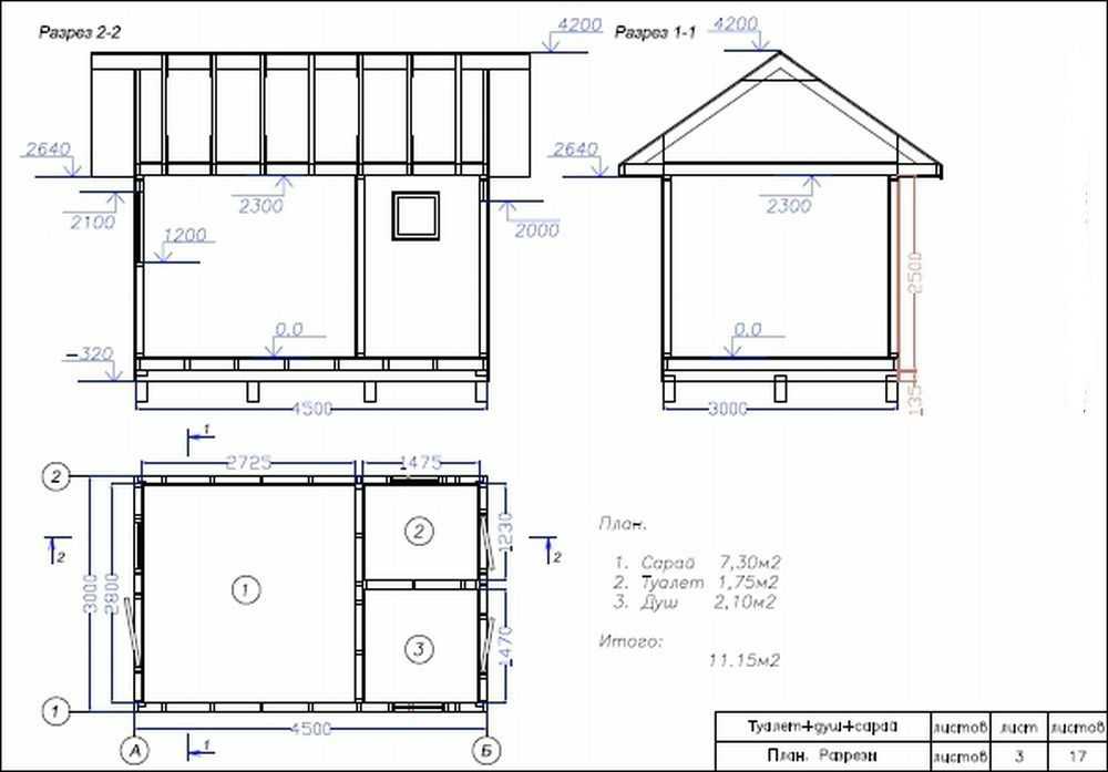 Чертежи наносят на бумагу с необходимыми размерами, соответствующими вашему выбору. Если дачный участок располагает ведению с/х хозяйства большой площадью, на нем вполне возможно построить хозблок для хранения инвентаря и огородных принадлежностей. В таком случае, вам понадобиться хозяйственный блок, совмещенный с кладовой (фото 1). Чтобы построить хозблок с туалетом и душевой, следует использовать это чертеж ( фото 2).