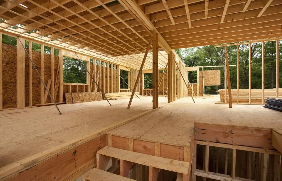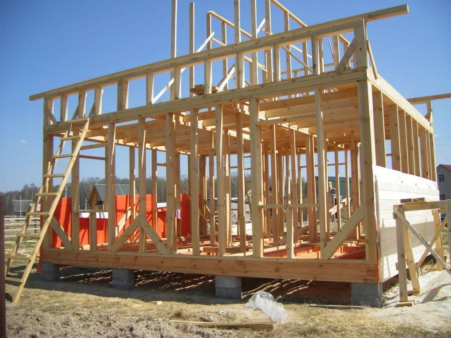 Для сборки каркаса деревянного дома хорошо подходит дубовый брус. Однако ввиду его высокой стоимости, можно обойтись сосновым брусом. Обшивается такой каркас снаружи фанерой либо ОСП. Между брусами прокладывается утеплитель, и изнутри также производится зашивка листом фанеры или ОСП.