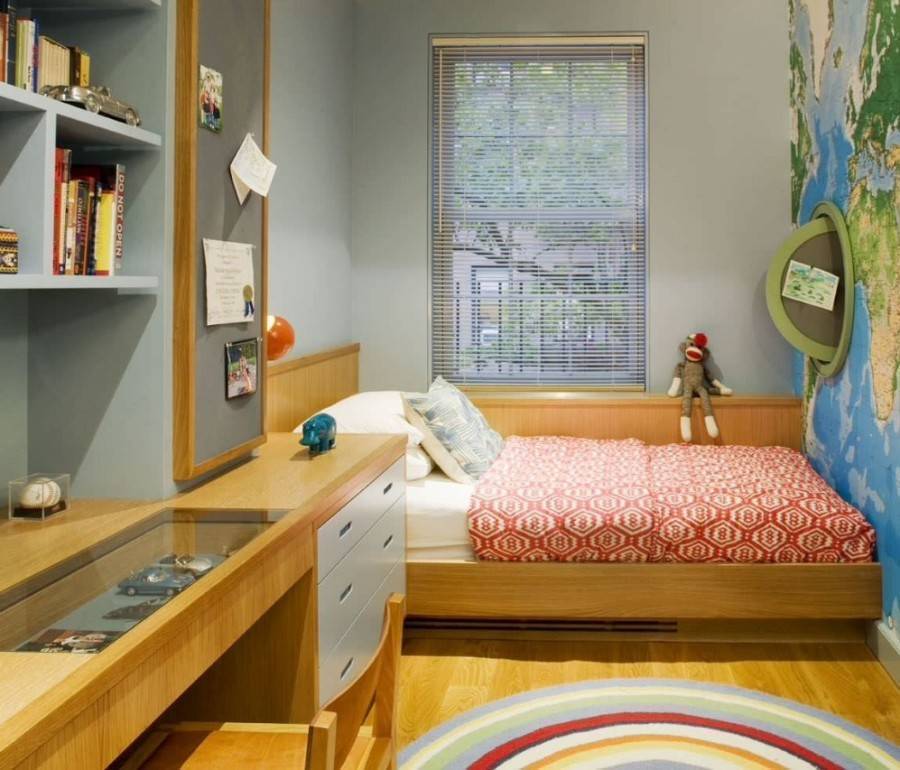 Полноценно отдохнувший ребенок хорошо учится, растет, развивается, поэтому удобство спального места – на первом плане. Лучше всего приобрести ортопедический матрас, такую же подушку. Спальную зону располагают у стены либо по центру комнаты, отделяя от остальных мест ширмой, одежным шкафом. Иногда ее обустраивают на подиуме, но только если ребенок не слишком маленький – иначе ему будет сложно забраться, возможны случайные травмы во время игр. Рядом ставят тумбочку, небольшой прикроватный столик. Для двоих детей предпочтительна двухъярусная кровать, при этом старший обычно спит на верхней полке. Конструкция требуется устойчивая, чтобы ее нельзя было расшатать, опрокинуть. Лесенка наверх монтируется с торца. Детям старше восьми лет делают симметричную кровать-чердак – два спальных места размещаются одно за другим, имеются лесенки с двух сторон. Внизу – два отдельных рабочих стола.