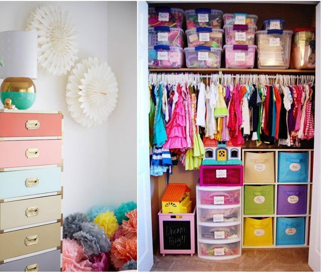 Оформляя дизайн детской для двоих, учитывайте и место, где будут храниться вещи. В особенности, для девочек необходим большой и достаточно вместительный шкаф. Во избежание конфликтов и недоразумений, шкаф также стоит разделить на пополам, отделив фасады его различными цветами. А для игрушек вполне неплохим вариантом будет обзавестись специальной корзиной или комодом.