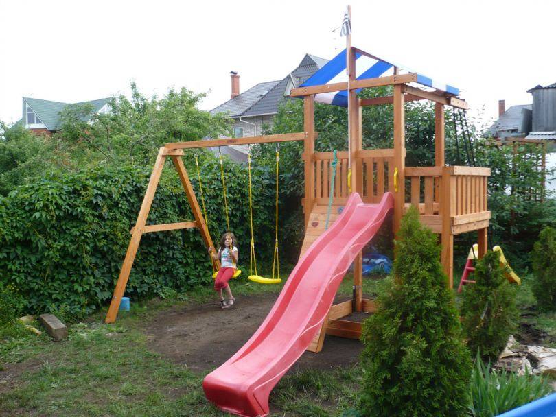 Деревянная горка с двумя спусками, домиком и качелями, построенная во дворе частного дома
