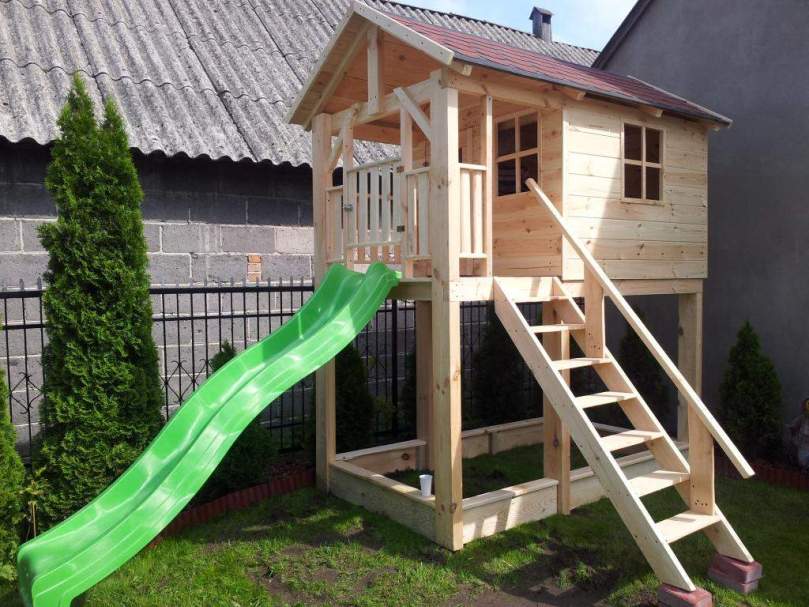 Для горки домик строится двухэтажный, либо установленный на опорных брусьях. Материала потратиться немного больше, чем для простого маленького домика для детворы.