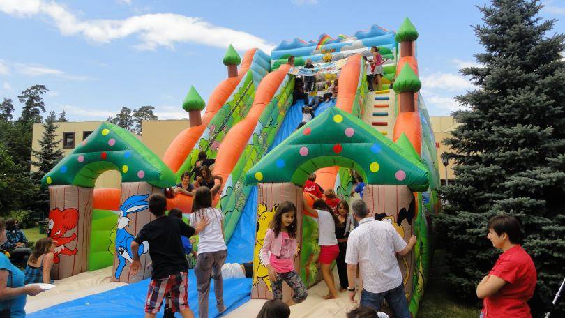 Надувные горки являются модификацией пластиковых и обычно сочетаются с небольшими бассейнами. К ним подключают воду и получают целый аттракцион.