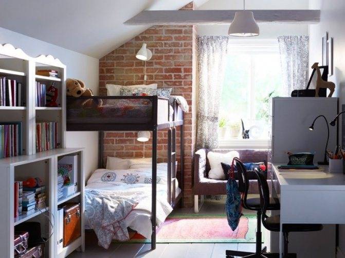 Если обустраиваете спальню на двоих ребятишек, «Икеа» предложит двухъярусные кровати. Некоторые модели предусматривают выдвижную кровать. При необходимости, она будет третьим спальным местом.