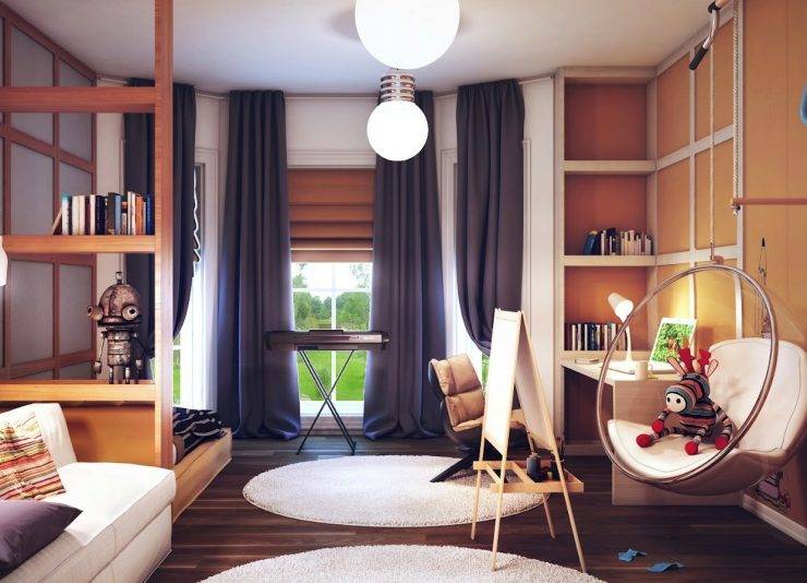 На территории для игр располагаются игрушки и шкафчики или ящики для их хранения. Когда ребенку исполнится 11 – 12 лет, эту зону можно убрать, и поставить на ее место небольшой диван или кресла для друзей ребенка.